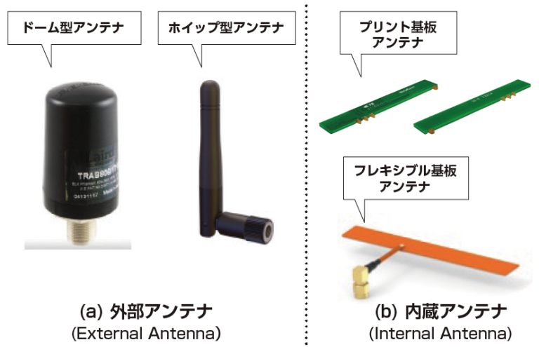 倉庫内の情報をクラウドへ安定的に送信するために,ワイヤレス機器に用いるアンテナの選定には十分な考慮が必要です.アンテナ種類や形状は通信範囲や伝搬性能に大きな影響を与えます.倉庫のような広範囲の通信が求められる環境では,図2(a) に示す外部アンテナ(ExternalAntenna)が多く使用されます.これはWi-FiルータやLPWA基地局などに搭載され,広いエリアをカバーしながら安定した通信の維持に貢献します.特にLPWA通信では低消費電力で長距離通信が求められるため,外部アンテナが使用されます.