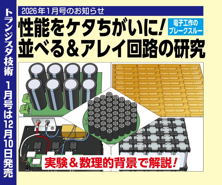 次号予告 2025年10月06日 編集部 Tweet 次号予告 2026年1月号予告[12月10日(水)発売予定] 次号の特集は, 特集 並べる&アレイ回路の研究 1月号は12月10日発売 ■コンデンサも複数個接続で性能アップ! ノイズ対策向けコンデンサ・アレイ ■パワーMOSFETの並列接続 ■集合部品で回路の性能アップ実験 ■超音波振動子アレイで実現!? パラメトリック・スピーカを使った 隣人に優しい「オレにしか聞こえない?」目覚まし時計の実験 ■磁気インピーダンス方式の地磁気センサアレイの製作 ■集束超音波で非破壊検査実験 ■アンテナを並べて高性能に!スタックアンテナ 並べると性能が桁違いになる?! 回路などの製作・実験を掲載します. みんな大好き「SPY-1」.フェイズド・アレイ・アンテナの解説もあるぞ. 並べて,作って,お試しアレイ.